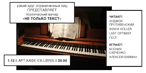 Ориентировочно Гест, Last_Optimist, Анджей Противенский, Хоакин и Sasha_Holler будут читать свои стихи. Или не будет. Или не только свои. Или не только они.